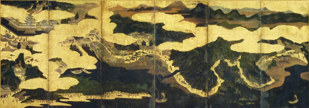 三保松原だけでなく駿河国の東海道沿いの名所を描いた屏風。駿府城・久能山東照宮、江尻の町並み、名刹として名高い清見寺、難所として知られる薩陀峠などが旅人の姿とともに描かれる。寛永〜寛文初年(1624-61)頃の制作と考えられる貴重な名所風俗図で、富士山が小さく描かれるのが、かえって珍しい。
